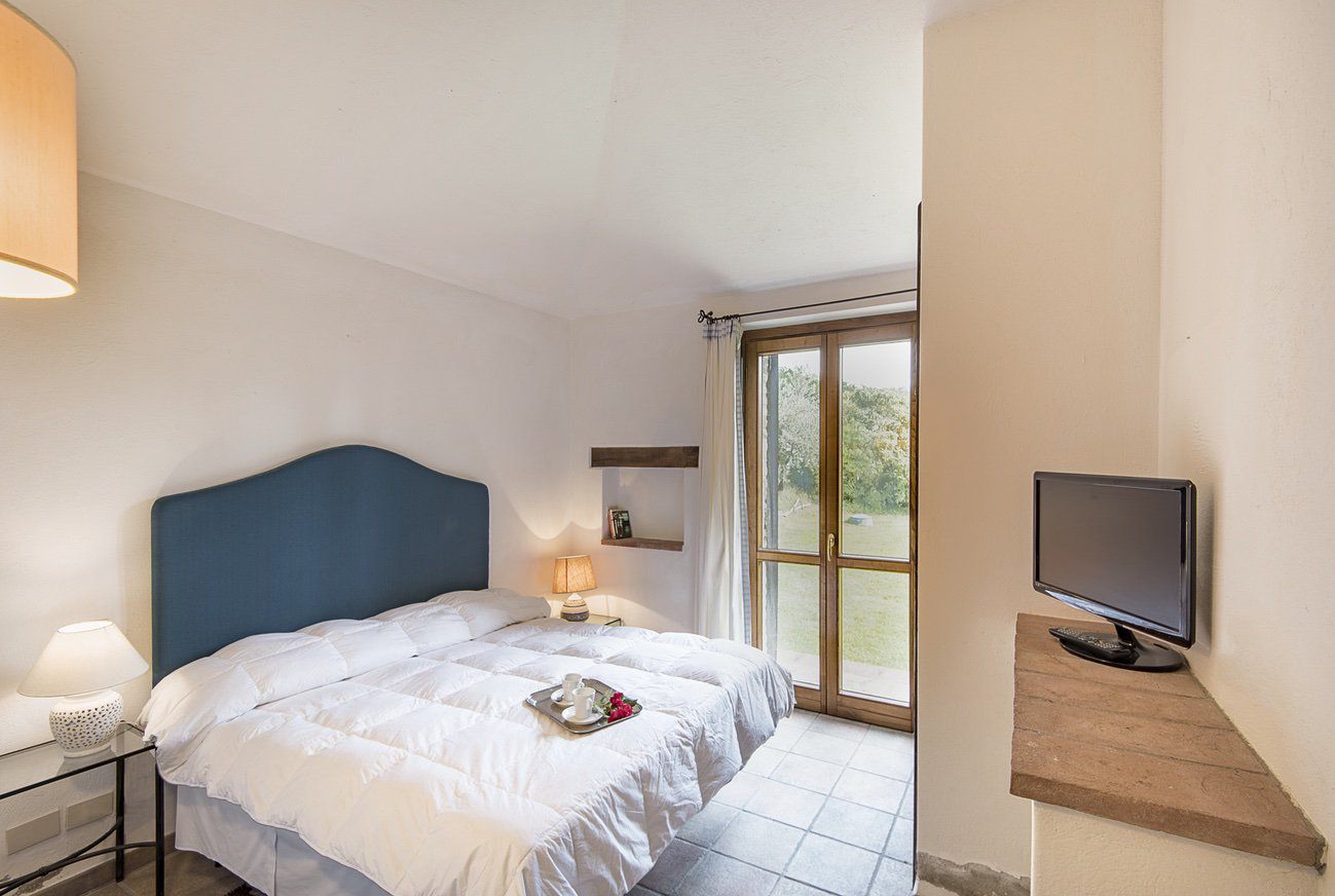 master bedroom (not convertible into a twin) with single sofa bed, TV and en suite bathroom with bath tub and shower cabin in the tub.