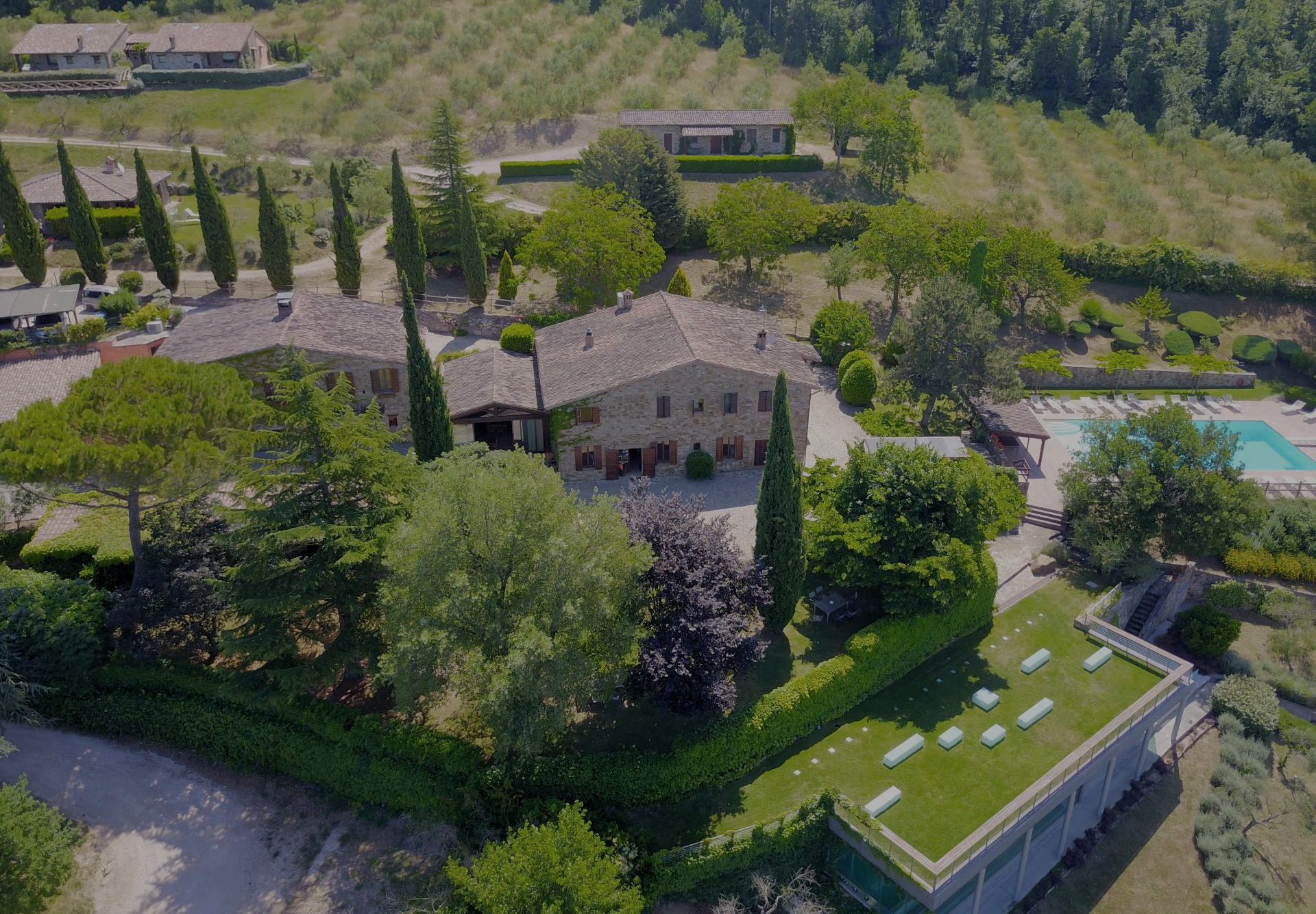At the end of a cypress-lined avenue running through the woods, the “courtyard” of the Umbrian hills opens up: the picture-postcard-perfect setting of Fattoria di Vibio. The villa consists of the main house with four bedrooms, three neighbouring guest houses and two panoramic and independence cottages. Opposite to the main house, there is an arbour of generous dimensions with access to the kitchen and the living room.